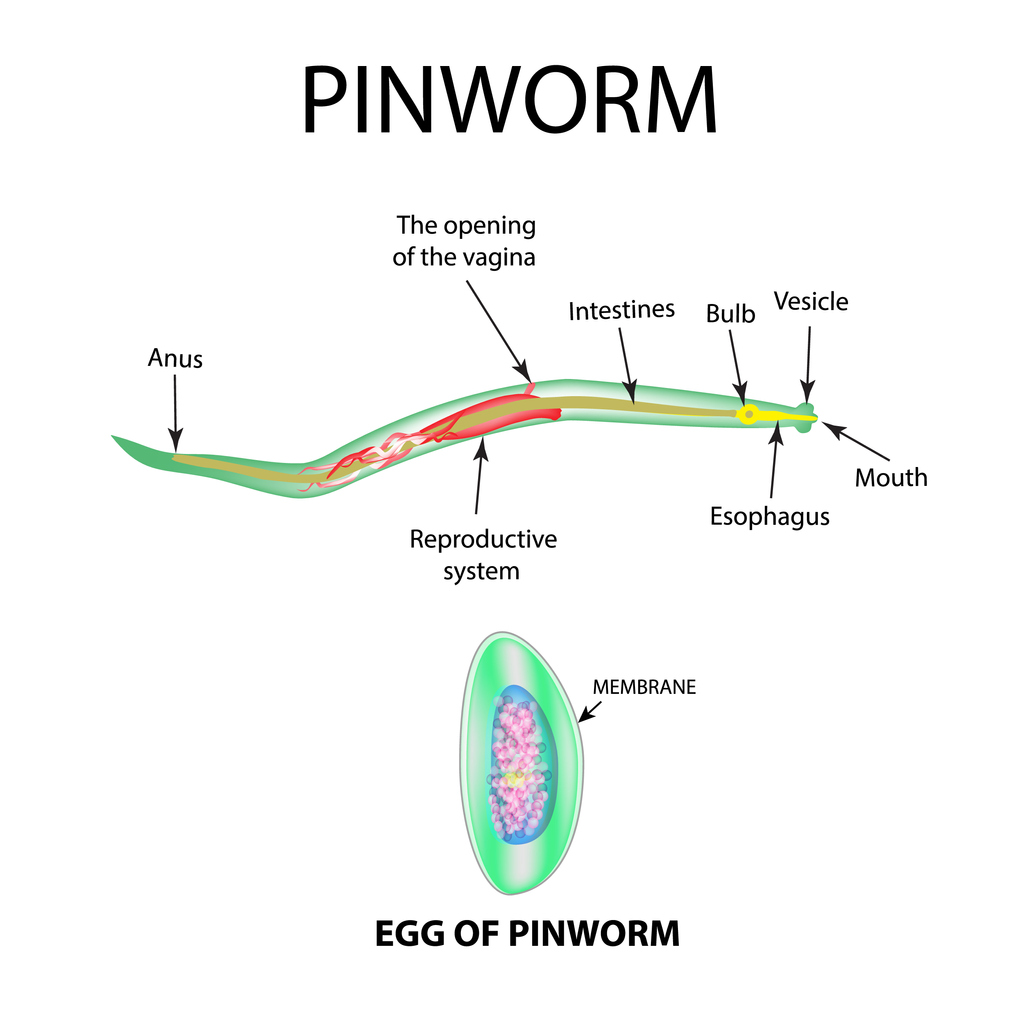 People develop enterobiasis after the ingestion or inhalation of infective eggs via contaminated hands or fomites. When pinworm eggs reach the intestines, they hatch and the larvae mature into adult female or male worms that live in the cecum, appendix, and colon.2,4 Typically at night, the adult female worms migrate out of the anus and deposit eggs on the perianal skin.2,3 The presence of these eggs may cause itching, a common symptom, and scratching of the area may result in scarification.4 It has been reported that, for most people, itching is the only noticeable symptom, and many people harboring the worms will be completely asymptomatic. Other symptoms that have been related to pinworm infection, especially in children, are insomnia and nervousness. Eggs are infective within hours after being deposited by the female worm, causing the disease to be easily transmitted.
